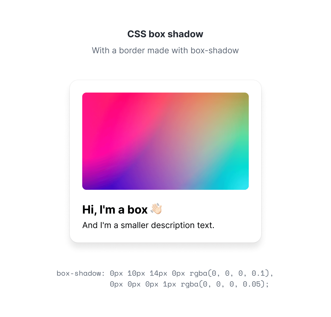 (, , , ), (, , , ); discover 30+ modern and beautiful css box shadows to elevate your web design. Our curated list offers a variety of styles, from subtle to bold, to fit. my idea was to use 2 box shadows to create the coloured shadow and the border for the coloured shadow. The full syntax for the box.